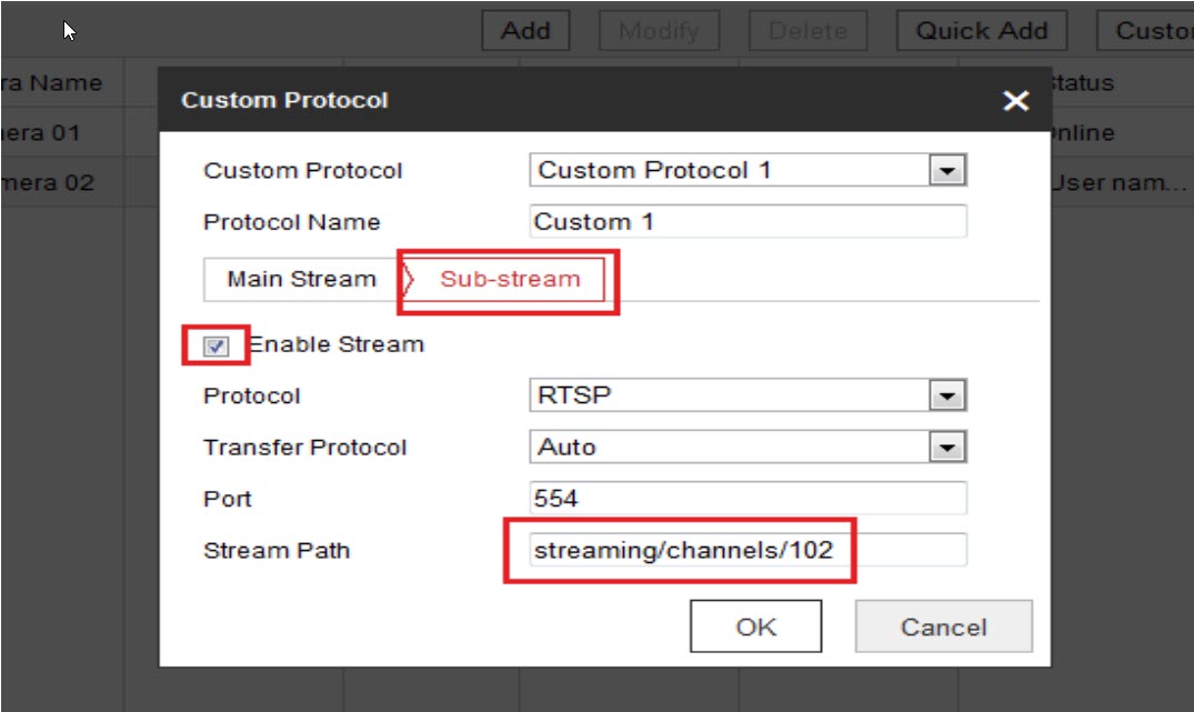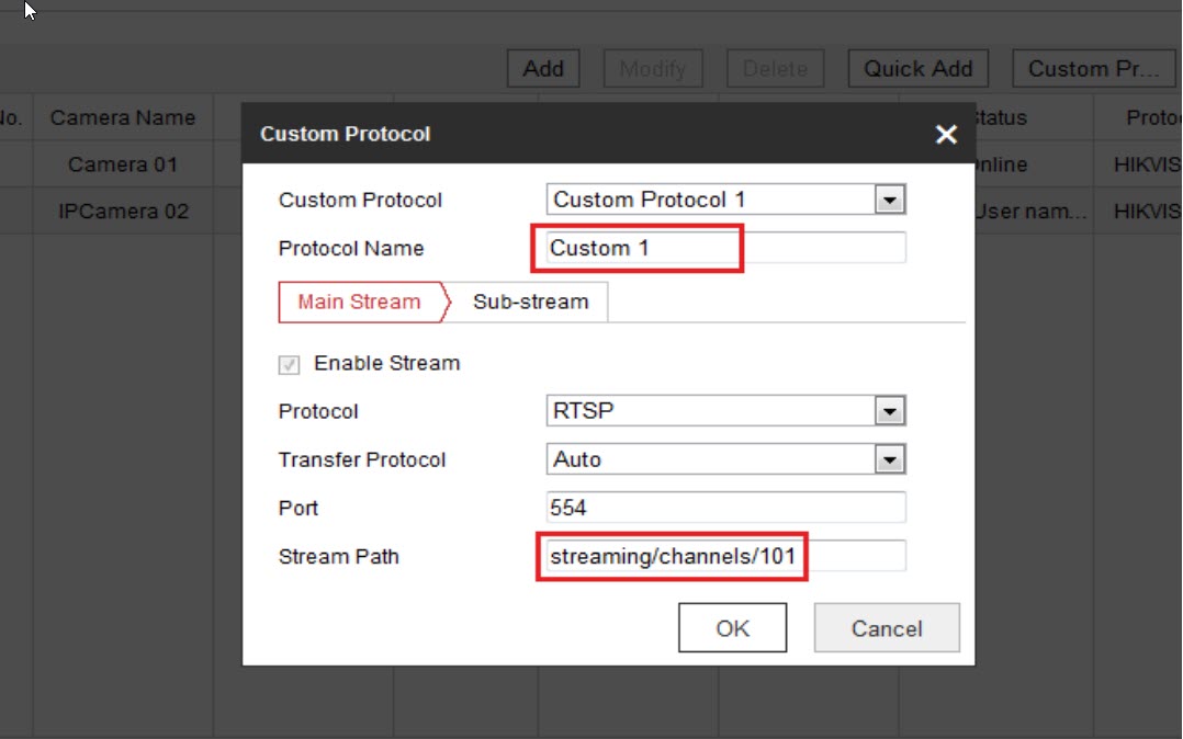 Giao thức tùy chỉnh được tạo bởi người dùng với cổng RTSP và 554. Sau đó, các camera IP có thể được thêm vào NVR bằng giao thức tùy chỉnh để có được luồng trực tiếp.