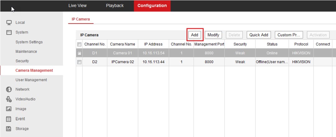 1 . Vào Cấu hình->hệ thống->Quản lý camera->Camera IP và nhấp vào Thêm Add