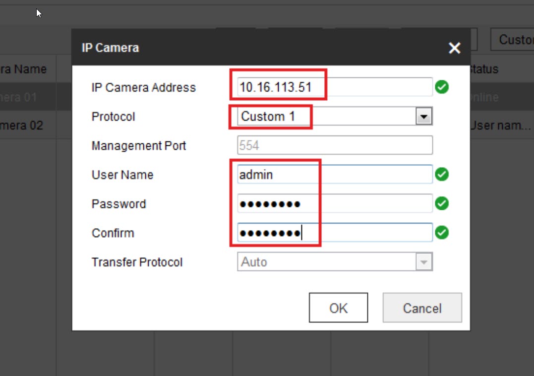 2 . Nhập địa chỉ Camera IP và chọn giao thức Custom 1 đã được tạo trước đó. Sau đó điền User Name và Password, nhấn OK
