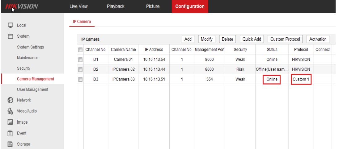 Lưu ý: Port quản lý của giao thức tùy chỉnh là port 554. Giao thức Hikvision là port 8000 và giao thức Onvif là port 80