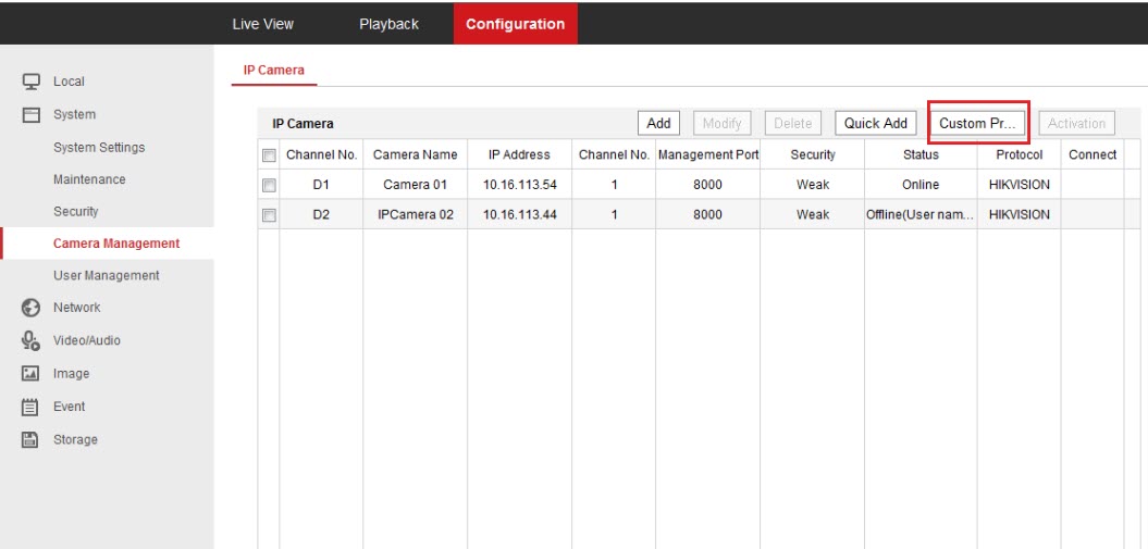 2 . Đăng nhập trang web của NVR, vào Cấu hình->hệ thống->Quản lý camera->Camera IP, nhấp vào Giao thức tùy chỉnh Custom Protocol