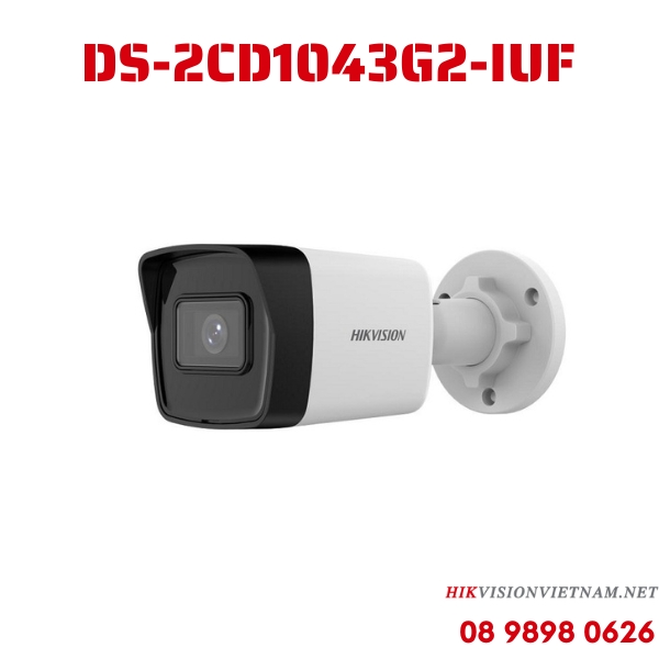 Camera Hikvision DS-2CD1043G2-IUF 4MP, hỗ trợ H.265+, âm thanh, chống báo động giả, tầm nhìn ban đêm, thiết kế ngoài trời bền bỉ, lý tưởng cho giám sát aninh hiệu quả.