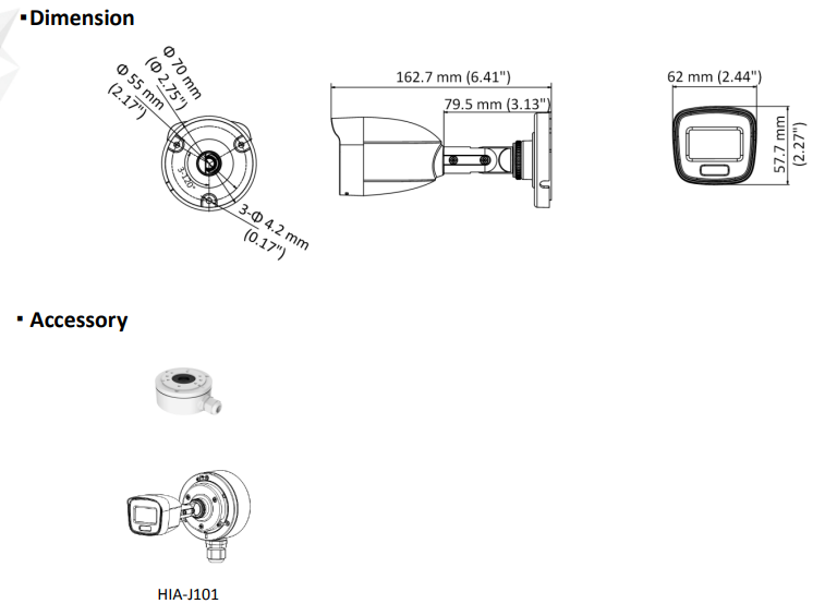 | Lens | 2.8 mm/3.6 mm/6 mm fixed lens | |