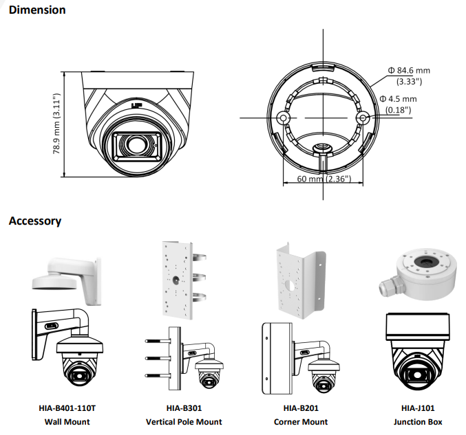 | Lens | 2.8 mm, 3.6 mm, 6 mm fixed lens |