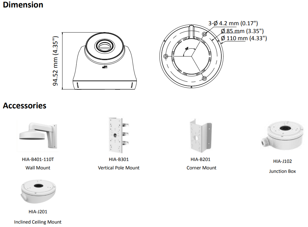 | Functions | Brightness, Sharpness, DNR, Mirror, Smart IR |