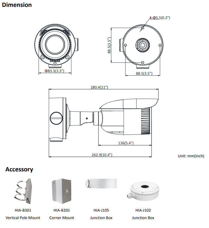Camera: Φ 105 mm × 244.4 mm (4.1inch × 9.6inch) With package: 315 mm × 137 mm × 141 mm (12.4inch × 5.4inch × 5.6inch) |