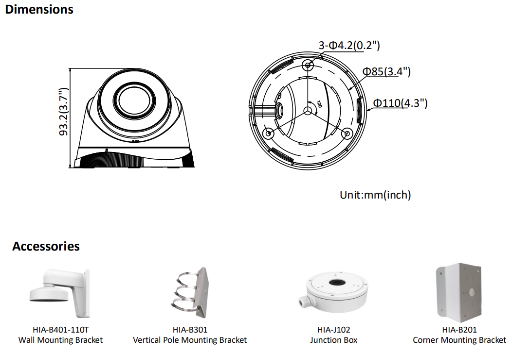 Camera: Ø 110 mm × 93.2 mm With package: 150 mm × 150 mm × 141 mm |