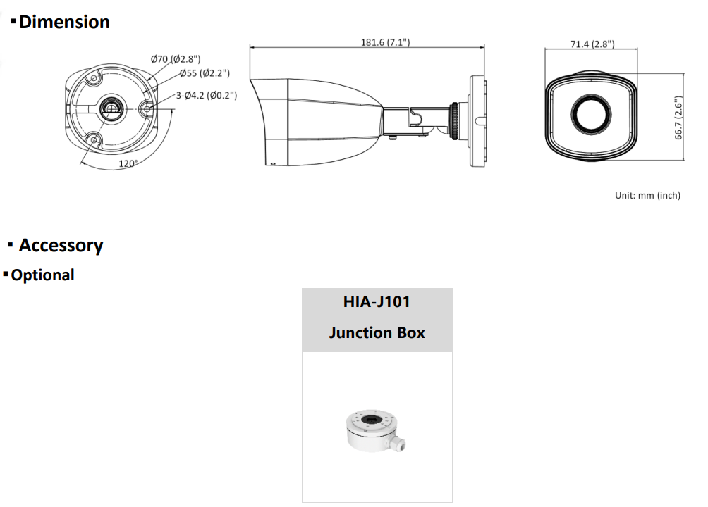 Camera IP: 70 mm × 191.3mm With package: 216 mm × 121 mm × 118 mm |