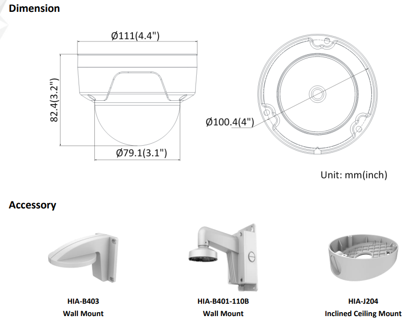 Camera: Φ114 mm × 82.4 mm (Φ4.5' × 3.2') With package: 134 × 134 × 108 mm (5.3' × 5.3' × 4.3') |