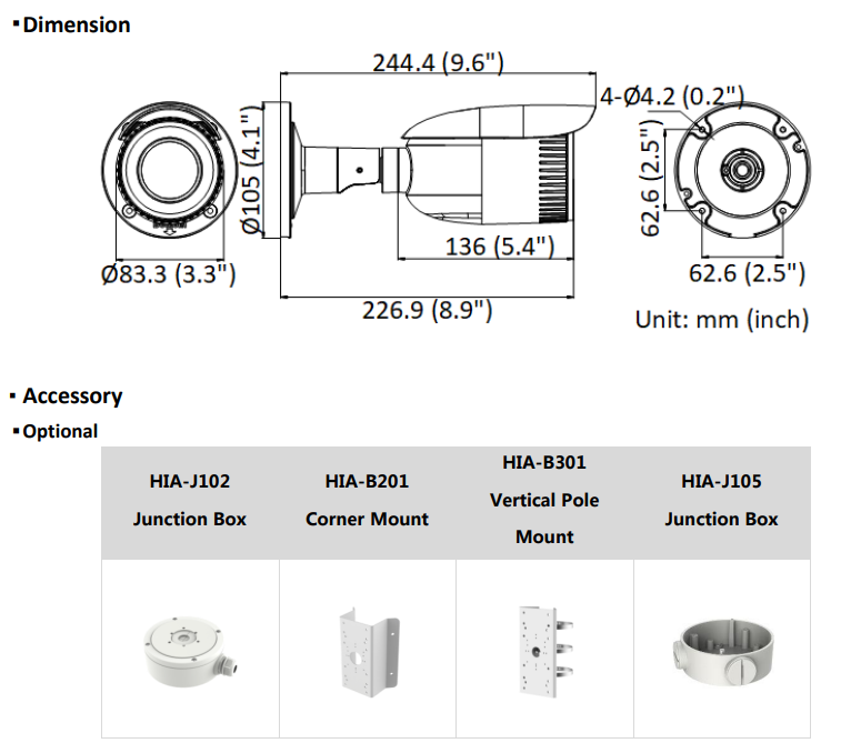 | Material | Camera body & bracket: metal, sunshield: plastic |