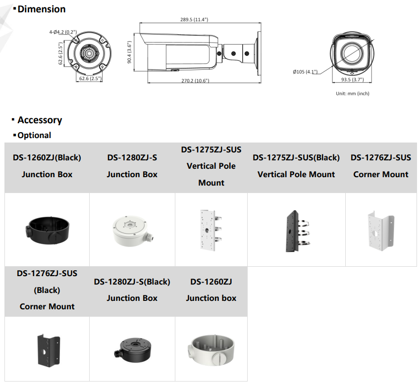 | Camera Dimension | Ø 105 × 289.5 mm |
