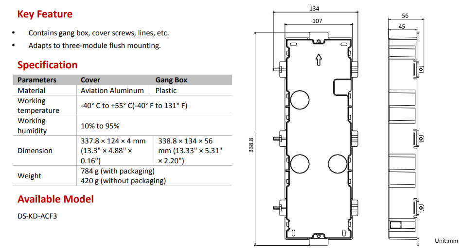 - Cover: 337.8 × 124 × 4 mm - Gang Box: 338.8 × 134 × 56 mm |