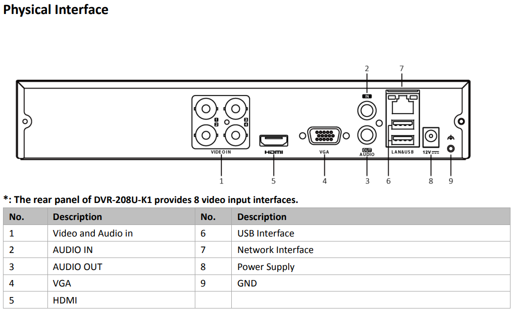 | Two-Way Audio Input | 1-ch, RCA (2.0 Vp-p, 1 KΩ) (using the 1st audio input) |
