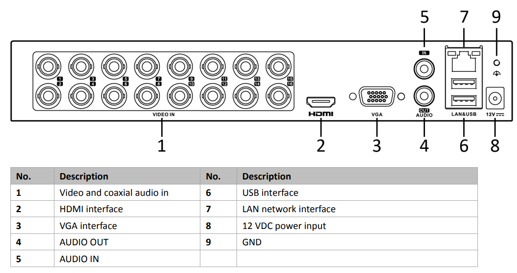 | Analog and HD-TVI video input | BNC interface (1.0Vp-p, 75 Ω) connection |