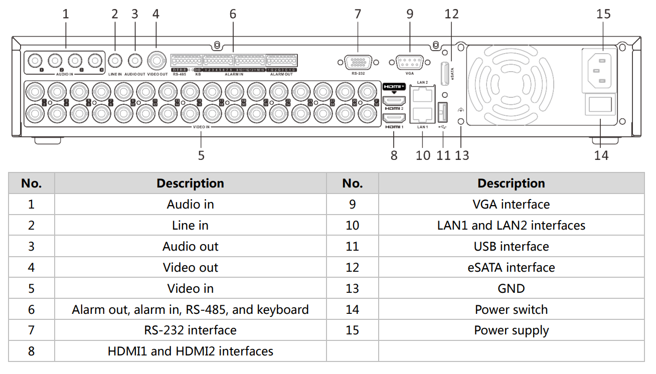 | Analog and HD-TVI video input | 24-ch,BNC interface (1.0Vp-p, 75 Ω)connection |