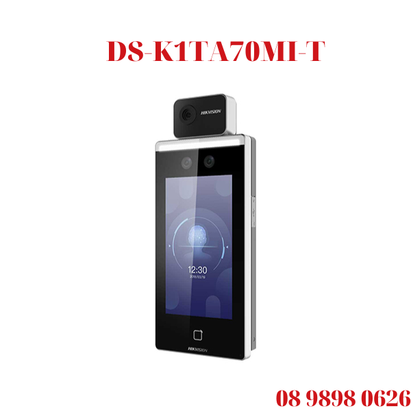 Máy chấm công nhận diện khuôn mặt kèm đo nhiệt độ DS-K1TA70MI-T Màn hình cảm ứng LCD 7 inch, ống kính góc rộng 2 Mega pixel, Tích hợp mô-đun đọc thẻ Mifare, Dung lượng tối đa 6.000 khuôn mặt,6.000 thẻ;