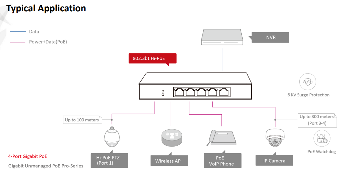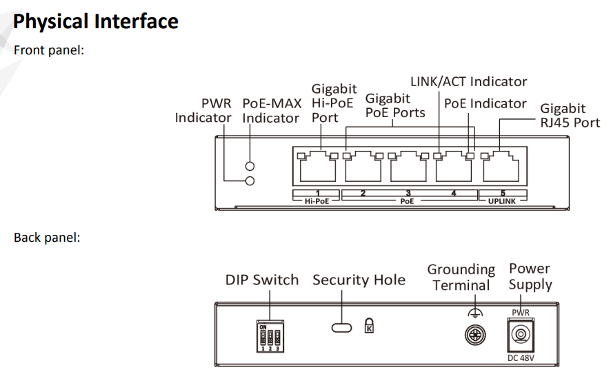 | Port number | 3 × gigabit PoE ports, 1 × gigabit Hi-PoE port and 1 × gigabit RJ45 port |