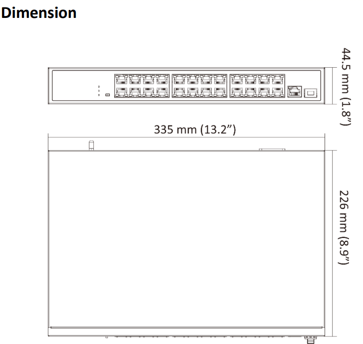 | Port number | 24 × 100Mbps PoE ports, 1 × 1000Mbps RJ45 port, and 1 × 1000Mbps SFP fiber optical port |