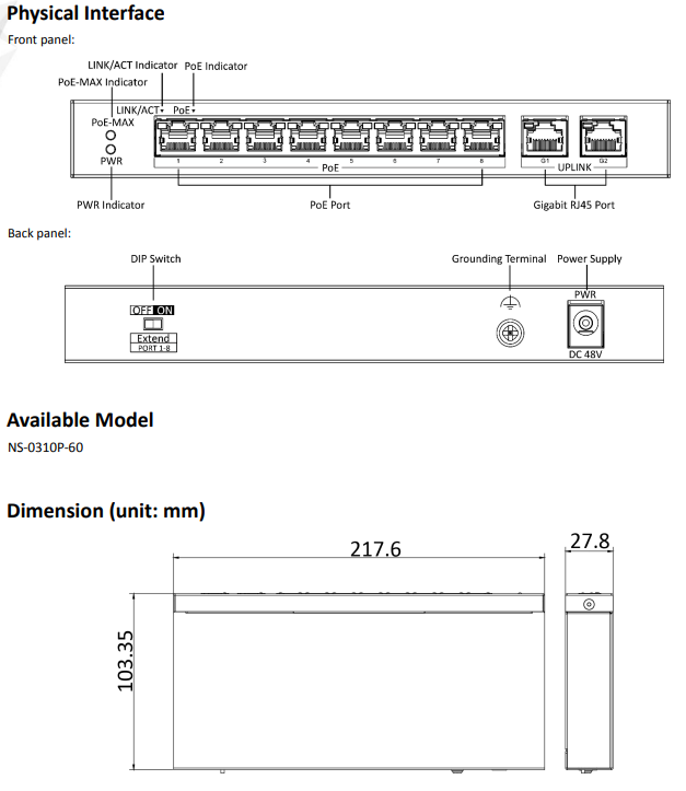 | Port number | 8 × 10/100Mbps PoE ports, and and 2 × Gigabit RJ45 ports |