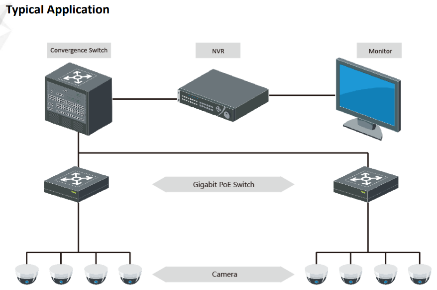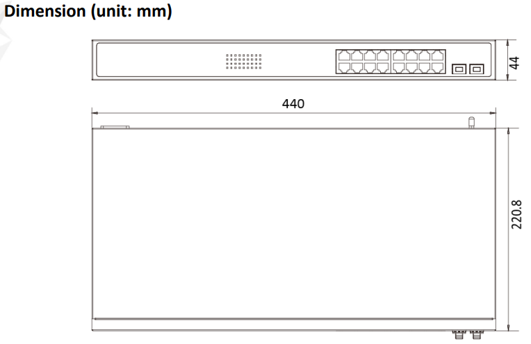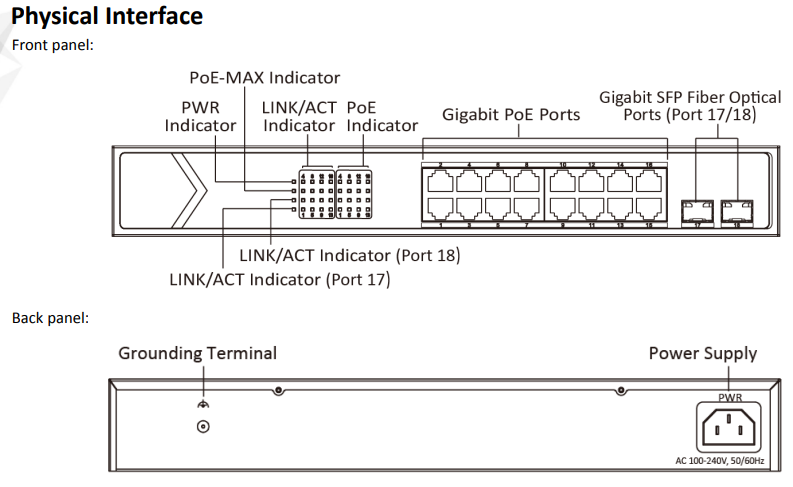 | Port number | 16 × Gigabit PoE ports, 2 × Gigabit SFP fiber optical ports |