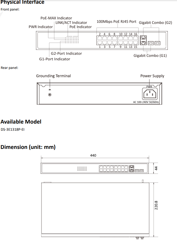 | Port number | 16 × 100 Mbps PoE RJ45 ports, and 2 × gigabit combos |