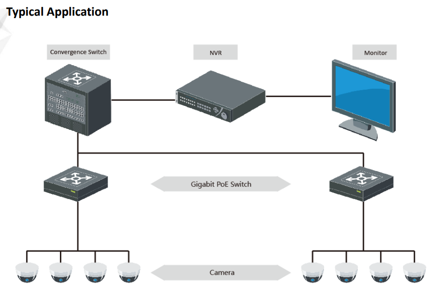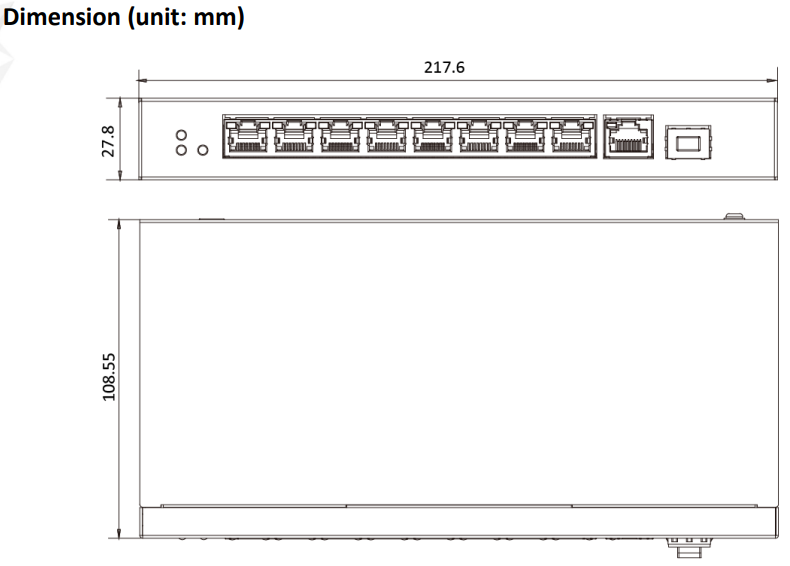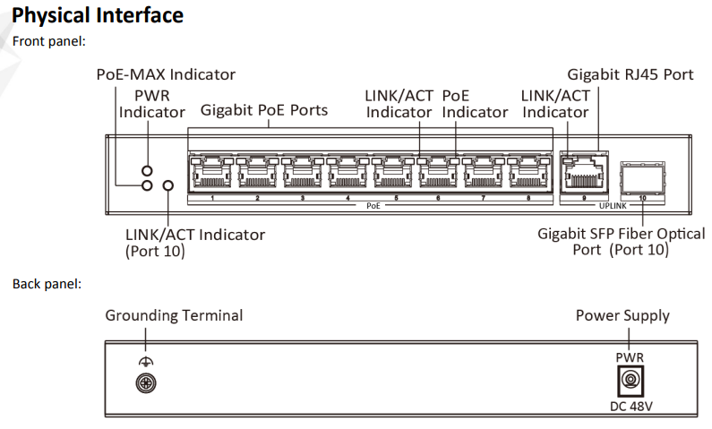 | Port number | 8 × Gigabit PoE ports, 1 × Gigabit RJ45 port, 1 × Gigabit SFP fiber optical port |