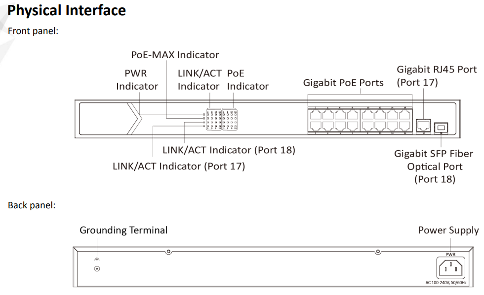 | Port number | 16 × Gigabit PoE ports, 1 × Gigabit RJ45 port, and 1 × Gigabit SFP fiber optical port |