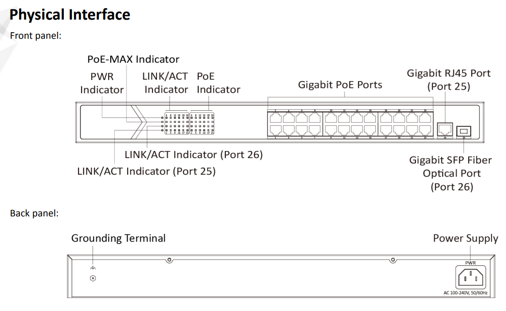 | Port number | 24 × Gigabit PoE ports, 1 × Gigabit RJ45 port, and 1 × Gigabit SFP fiber optical port |
