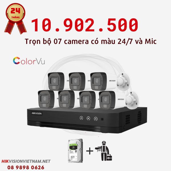 Lắp đặt ngay trọn bộ 07 camera có màu 24/7 và mic HD Hikvision, thế hệ TVI mới nhất trong dòng camera quan sát, tên miền miễn phí trọn đời.