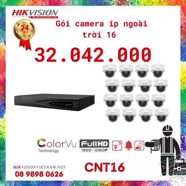 Lắp đặt ngay trọn bộ 16 camera IP ngoài trời full HD 1080 Hikvision, thế hệ TVI mới nhất trong dòng camera quan sát, tên miền miễn phí trọn đời.